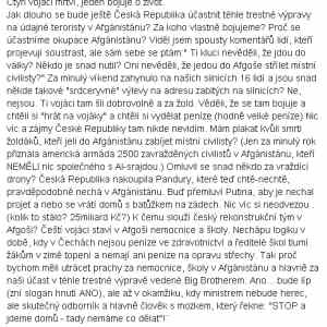 Alfonz Klacek, BeNiSh... O Afghanistánu zjevně nic, krom lží z diskuzí nevíš. A ještě se na základě lží sereš do vojáků. Pokud si někdo chcete stěžovat, proč jsou vojáci na jakékoli misi, oslovte politiky a rozhodně ne vojáky, ti s tím nemají nic společného. Pro ujasnění pojmů, žoldáky mají v AFG leda povstalecké skupiny, většinou zahraniční odnože Talibánu (velice často to nejsou Afghánci). Soukromí kontraktoři tzv PMC jsou vázáni spoustou regulí a také bych je nenazval žoldáky, i když by tuto definici... |