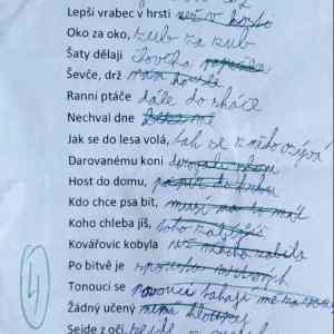 To dítě pochopilo rým a kromě několika vtípků ho správně napsalo všude. Přemýšlím, jak by zápasily moje dcery s podobným testem v němčině, když nemají šanci ta přísloví znát. Jen vtipy s Otto und Traktor. |