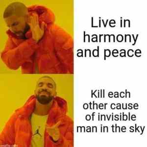 lidi nepotřebují žádného neviditelného mužíka aby se zvládli vraždit po milionech. Stačí si vzpomenout na nacismus a komunismus. Shrňme to prostě pod ideologie. |