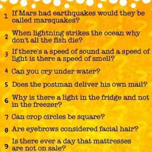 Kromě třetí otázky, jsou všechny nejen jasné, ale i nevtipné. Tím myslím, že třetí otázka je vtipná. |